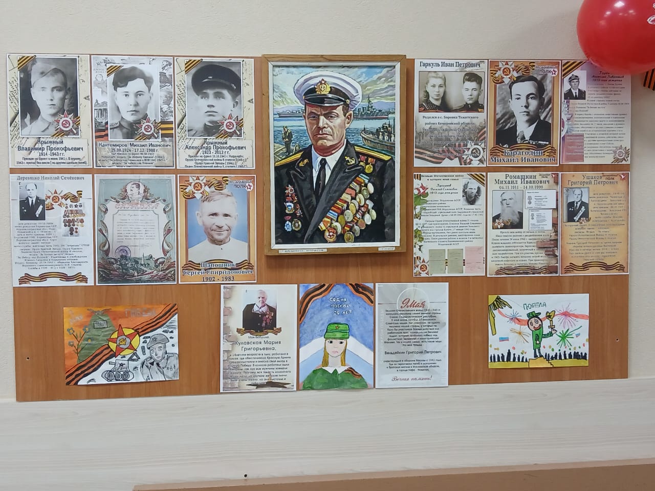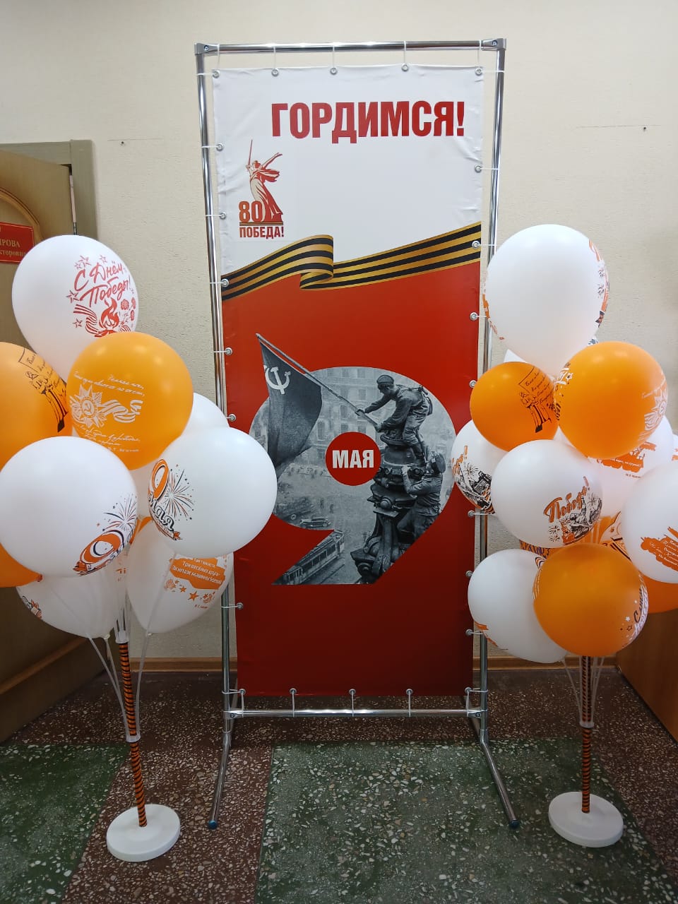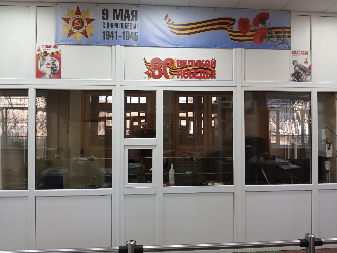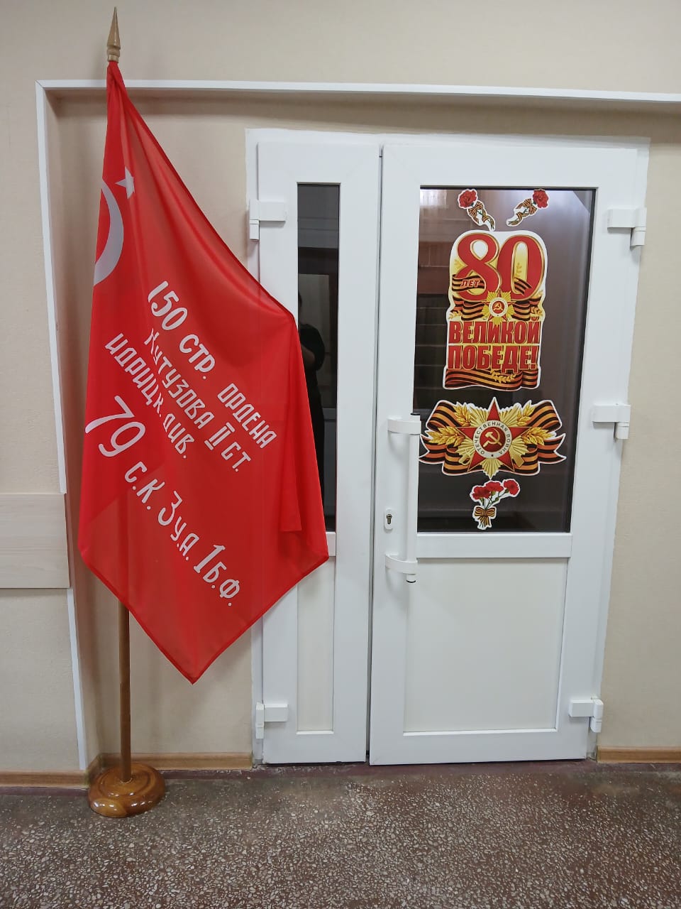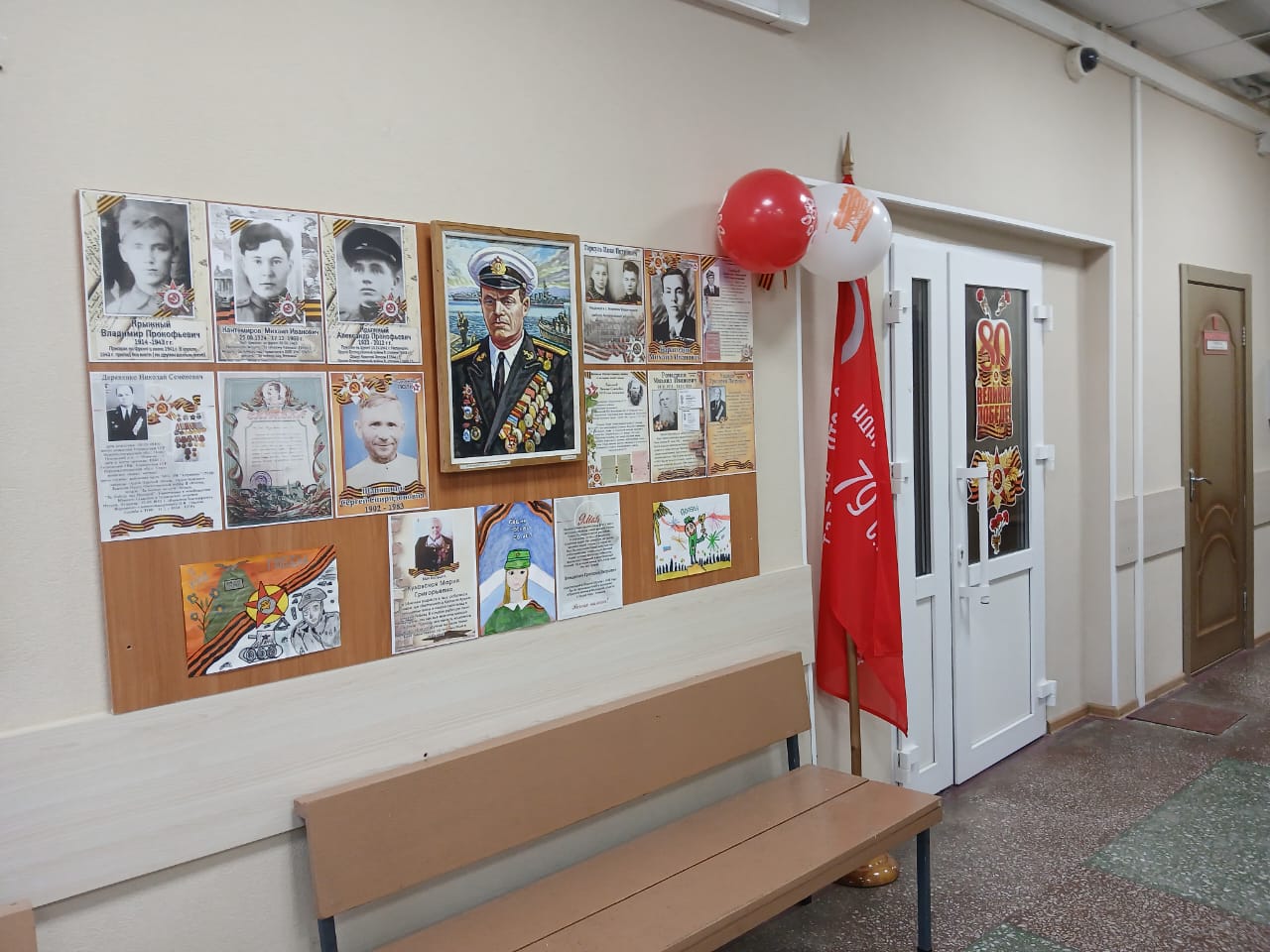 В рамках мероприятий, посвященных 80-й годовщине Победы в Великой Отечественной войне 1945-1945 гг., в здании Советско-Гаванского городского суда сотрудниками празднично оформлен холл. В холле на стенде размещены фотографии участников «Бессмертного полка» - родственников сотрудников суда, с указанием фамилий, имен и отчеств, полученных наград. А также на стенде размещены рисунки детей, работников суда, принимавших участие в конкурсе: «Победа глазами детей», посвященном памятной дате. В холле здания суда установлена копия Знамени Победы